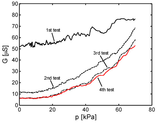 The black solid line in Figure 13 shows the variation of G for the MLG-F20 specimen as a function of the applied pressure p (or stress σ) in kPa during the first test performed with a crosshead speed v1 = 1 mm/min. The electromechanical response repeatability of the fabricated sensors has been investigated performing consecutive quasi static monotonic compression tests. Notice that, despite the significant decrease of the conductance in Figure 13 after the first and second test, the piezoresistive signal stabilizes rapidly. A similar behavior has been already observed in nanocomposite-based strain sensors due to the occurrence of damages at micro- and nanoscale and inter-filler separation [11,30,31,32]. Likewise, in the case of infiltrated foams, the response variations can be attributed to the irreversible transformations of the tridimensional MLG percolation network coating the cell walls, especially during the first applied mechanical loadings.