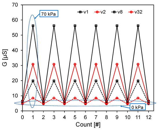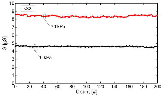 where G0 is the conductance in the unloaded condition and G(p) is the measured conductance with an applied pressure p (i.e., stress σ). Differently from the mechanical properties, the sensor piezoresistive behaviour is affected sensibly by the strain rate. At the lowest speed v1 (i.e., ~ 0.0026 s−1), ΔG% is almost constant up to a pressure limit plim ≈ 10 kPa. For higher pressures (i.e., p > plim), when corresponding to the densification regime of the foam, ΔG% shows a monotonic increase. Differently, at higher cross-speed velocities (i.e., v2, v8 and v32), the sensor shows a negative and almost linearly decreasing ΔG% up to p ≈ plim. Beyond that value ΔG% reverses the trend and starts to increase with a rising rate which is higher for lower speeds. Although the piezoresistive sensor output undergoes significant changes in response to different velocities, it shows a high repeatability after the mechanical stabilization shown in Figure 13. This fact is confirmed by the results reported in Figure 15 and Figure 16. Figure 15 displays the conductance recorded at the beginning and at the end of each of the six monotonic loading tests performed in sequence (with an applied pressure ranging from 0 kPa up to 70 kPa), and repeated for the different crosshead speeds v1, v2, v8 and v32. Figure 16 shows the conductance values measured at two different applied pressures during one hundred consecutive compression tests carried out at the maximum speed v32 (the most severe test condition). It is noted that the sensor provides a high repeatable response throughout all the cycles. In particular, with reference to Figure 16 it is observed that the conductance average values at 0 kPa and 70 kPa of applied pressure are 4.65 μS and 8.45 μS, respectively with a standard deviation of 0.15 μS and of 0.16 μS.