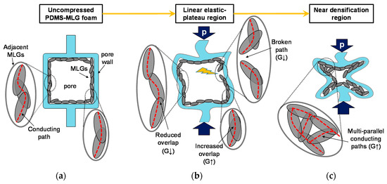 Without an applied pressure (Figure 17a), the MLGs-coating adheres and mimics the PDMS foam inner structure, as also seen in the SEM images. At the lowest investigated strain rate, in the linear elastic and plateau regions, G is practically constant. This means that the overall electrical resistance of conductive paths created by the MLGs remains almost unchanged. In fact, during loading, some parts of the foam walls are subjected to compressive stress while others to stretching. Therefore, adjacent MLGs adhering to the PDMS skeleton surface are induced either to increase or decrease their overlapping area (if in contact, otherwise reduce or increase their mutual distances) (Figure 17b). We can speculate that this behavior is possible thanks to the MLGs good adhesion with the foam and to the low friction between sliding flakes [33]. As a result, although the MLGs relocation leads to modify the value of the local contact resistances, from a statistical point of view the overall effective resistance of the foam remains almost constant.