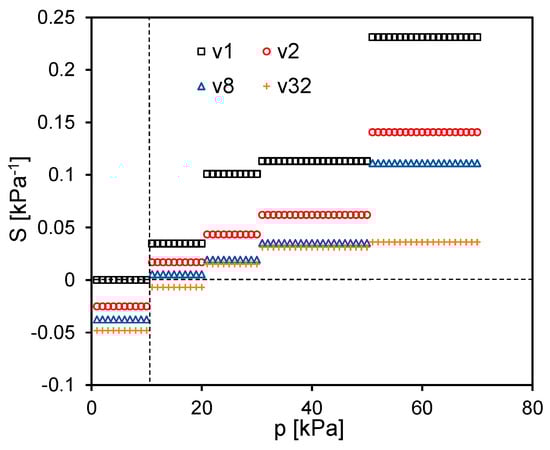 The response of the sensor is then investigated at different crosshead speeds (v1 = 1 mm/min, v2 = 2 mm/min, v8 = 8 mm/min, v32 = 32 mm/min). In particular, Figure 14 shows the relative percentage electrical conductance variation as a function of the applied pressure in kPa: