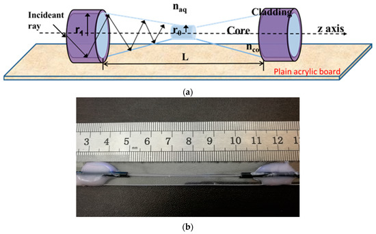 (a) Schematic diagram; (b) photograph of bonded tapered polymer fiber sensor (TPFS).