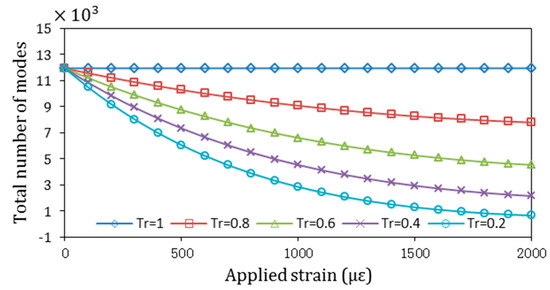 Total number of modes is a parameter that can be used to indicate the light intensity that is guided by TPFS. As such, the transmitted light intensity guided by TPFS can be modulated by the applied strain and thus its capability for vibration detection. The total number of modes guided by TPFS varied with the various taper ratios, and applied strains were numerically simulated (results are shown in Figure 2). The numerical results are based on the parameters given for plastic optical fiber: r1 = 480 μm, nco = 1.492, ncl = 1.402, λ = 594 nm, and L = 0.05 m. The results in this figure show that the total number of guided modes are decreased with the increased of applied strain. The decrease tendency of total number of modes for TPFS with smaller taper ratio is faster. The results also show that as the applied strain increases, the number of modes is decreased slightly for an untapered fiber (Tr = 1). The large decrease tendency for the number of modes indicates the high vibration detection sensitivity of TPFS. Besides, the results in this figure indicated that the vibration detection sensitivity can be enhanced by tapering the POF significantly.