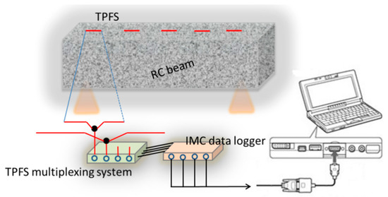 The TPFS multiplexing system for vibration and loading test monitoring is shown in Figure 4. In this system, four sensor probes are multiplexed into one system which integrates four the light-emitting diodes (LEDs) and four Photo detectors (PDs) to emit and detect the light, respectively. Five sensor probes were produced using the POF with the same parameters. A circuit was designed to provide a stable current to drive LED (red light, centered at 660 nm) and PDs. The LEDs driven by this circuit show an excellent stability for output light intensity. The PD converts the light power into voltage signal. Then, the voltage signals are received by an integrated measurement control instrumentation (IMC) data logger. A long-term drift study indicates that the driving circuit had a very good stability, which is ±2%. In this system, all of the TPFSs are synchronized to detect the vibration on a reinforced RC beam. The room temperature was also monitored by a thermocouple. The test was performed for 48 h, and a maximum drift of ~2% and 2.0 °C was found for light intensity and room temperature, respectively. This is indicating that the experimental works are under a very well-controlled ambient condition.