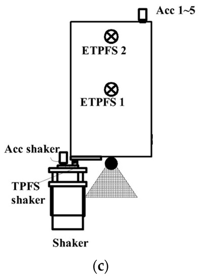 Experimental setup of vibration monitoring system: (a) photograph of vibration test for the RC beam; (b) layout of accelerometers, surface-mounted TPFSs (SMTPFSs) and ETPFSs installation; (c) cross-section view of sensors installation.
