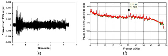 Detected vibration in time domains and their corresponding frequency domains on the RC beam for (a,b) Kistler accelerometer; (c,d) ETPFS; (e,f) SMTPFS.