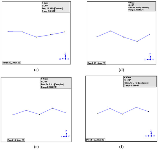 Mode shapes of the RC beam detected by SMTPFSs for (a) mode 1; (c) mode 2; (e) mode 3; and by accelerometers for (b) mode 1; (d) mode 2; (f) almode 3.