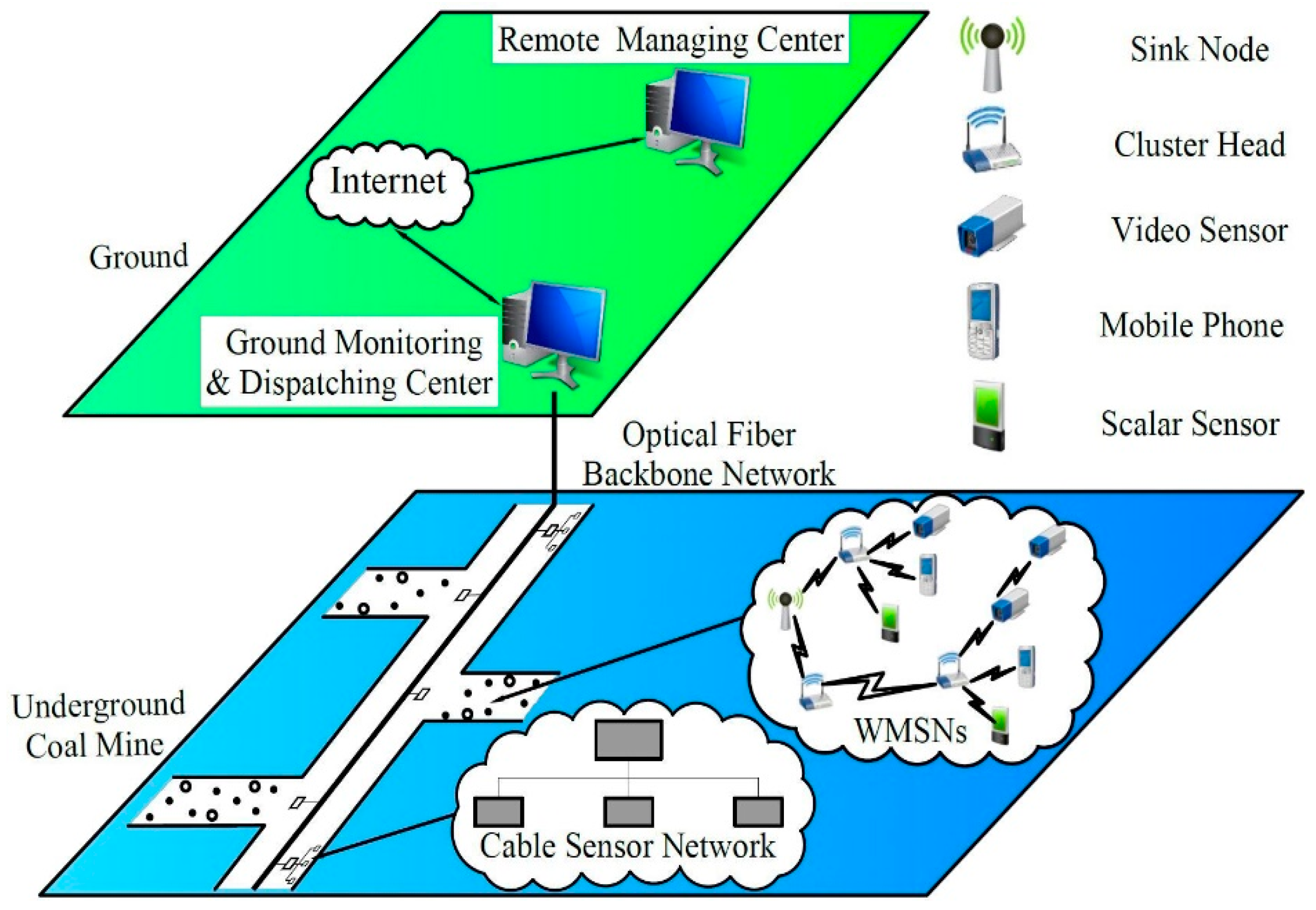 Using WMSNs to monitor the environment of coalmines attracts interests of many researchers in recent years. For instance, strategies of deploying WMSNs in underground coalmine have been put forward by Han and Yang [7,8]. Sun et al. [9] proposed a wireless multimedia sensor network self-organization protocol for mine rescue that showed the schedules for establishing a self-organization network quickly and prolonging the lifetime of network. Zhang et al. [10] showed an ultra-wide band (UWB) transmitting and receiving strategy with complicated and low bit rate performances in different mine roadway environment. However, most of these works are theoretical research focusing on certain technology, from which we cannot get a comprehensive understanding of the overall structure and developments of WMSNs for underground coalmine.