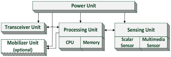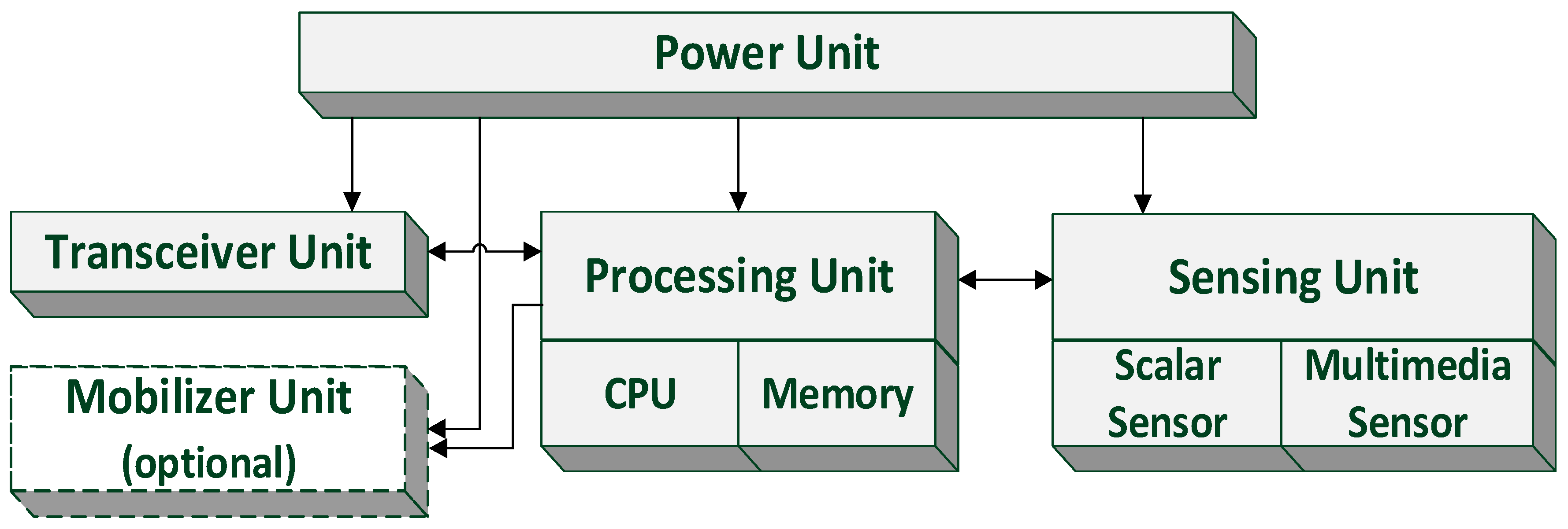 The difference between the hardware of sensor nodes in WMSNs and that in traditional WSNs is that the sensor nodes of WMSNs are equipped with CMOS sensors that can ubiquitously capture images and videos, and processors that have stronger processing capacities. However, the basic components of sensor nodes in WMSNs and those in WSNs are basically the same, which can be divided into four parts as shown in Figure 2: a sensing unit, a processing unit, a transceiver unit and a power unit [4,15]. The mobilizer unit in Figure 2, which allows movements or manipulation of objects or a sensor node itself, is optional according to the requirements for monitoring. Ignored by other surveys for WSNs and WMSNs, the electrical explosion proof issue for sensor networks is emphasized here, since the environment condition of a coalmine is usually harsh and dangerous and deserves more attention and design efforts. In addition, the issues of safety, immunity, protection, size, design, and reliability need to be considered for communication devices and equipment.