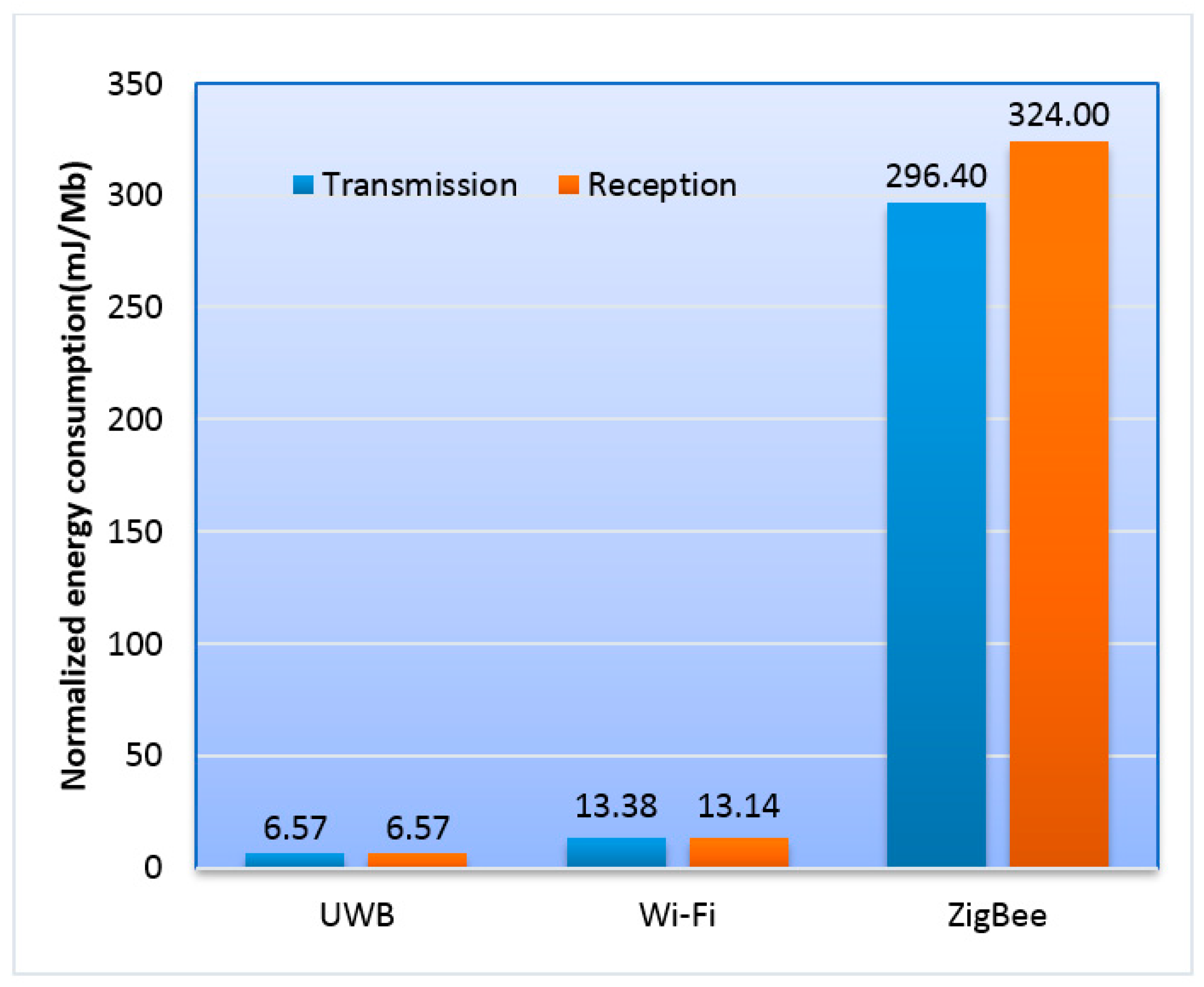 Comparison of UWB, Wi-Fi and ZigBee in normalized energy consumption by choosing four typical wireless products from [27].