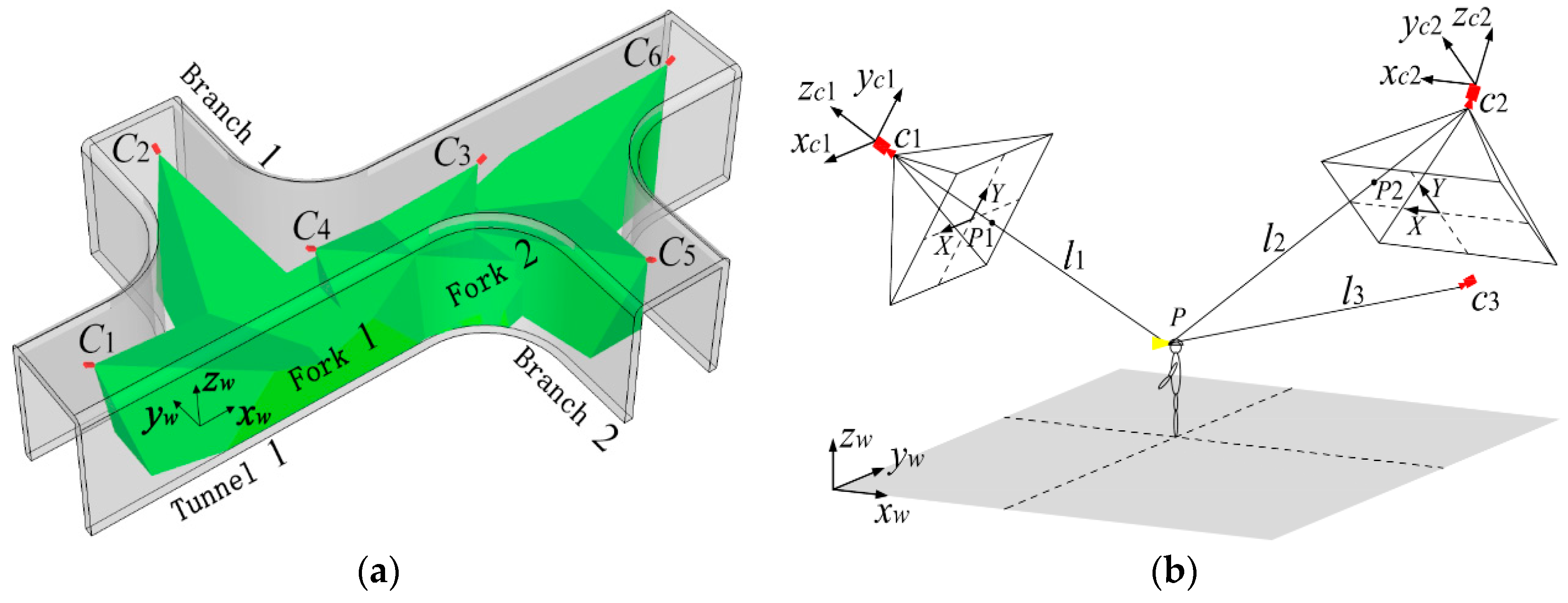 Video collaborative localization of miner’s lamp based on WMSNs: (a) localization scene; and (b) camera vision imaging model.