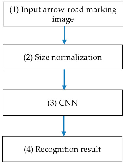The arrow-road markings on a road surface typically become illegible or unidentifiable as the car tires erode the paint on the marking. Although this makes it difficult to correctly recognize the arrow-road marking, and represents an important problem but there is little research activity in the recognition of this type of damage to arrow-road markings. We propose to fill this research void and introduce a method that uses a convolutional neural network (CNN) to recognize six types of road markings of arrows, including damaged arrow-markings on the road surface. Recently, deep learning-based methods such as deep neural networks and CNNs have shown encouraging results in the field of computer vision and pattern recognition. Convolution can allow image-recognition networks to function in a manner similar to biological systems and produce more accurate results [20]. In recent works, a CNN has also been used for detection and classification of traffic signs [21], lane detection [22], and lane position estimation [23]. However, there is no previous research documenting studies of arrow-road marking recognition based on a CNN.