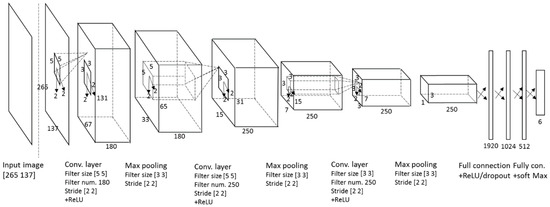We use gray-scale images as the input whose height and width are 265 and 137 pixels, respectively. Therefore, the first convolutional layer requires 265 × 137 × 1, and it is convolved with 180 filters having size 5 × 5 × 1 at stride two. In this case, the number of weights per filter is 5 × 5 × 1 = 25, and the total number of parameters in the convolution layer is (25 + 1) × 180 = 4680, such that 1 represents the bias. The size of the feature map is 131 × 67 × 180 in the first convolutional layer, such that 131 and 67 are the output height and width, respectively, calculated based on (output height (or width) = (input height (or width) − filter height (or width) + 2 × padding)/stride +1 [26]). The outputs pass through the ReLU layer and a cross channel normalization layer. After processing by the max pooling layer with filters of size 3 × 3 applied with a stride of two, every depth slice in the input is down-sampled by two along height and width. Therefore, the output of the max pooling layer is calculated as 65 ((131 − 3 + 2 × 0)/2 + 1) × 33 ((67 − 3 + 2 × 0)/2 + 1) × 180, based on the equation (output height (or width) = (input height (or width) − filter height (or width) + 2 × padding)/stride +1 [26]). The depth dimension remains unchanged at 180 after the max pooling operation. The size of the feature map after the max pooling layer is 65 × 33 × 180, and this is convolved with the second convolutional layer that uses 250 filters, each having size 5 × 5. This is followed by the max pooling layer with filters of size 3 × 3, applied with a stride of two that reduces the size of the feature map. Then, the third convolutional layer also has 250 filters, each having size 3 × 3 at stride two. After applying another max pooling layer with filters having size 3 × 3 with a stride of two pixels, the output is represented by 750 (=3 × 250) feature maps, which are used as the inputs to the first fully connected layer.