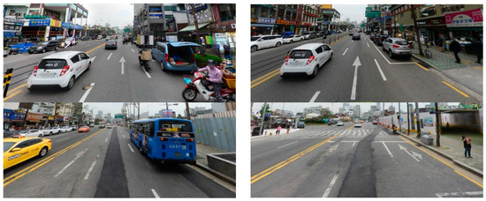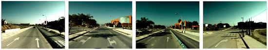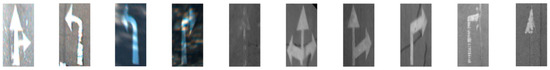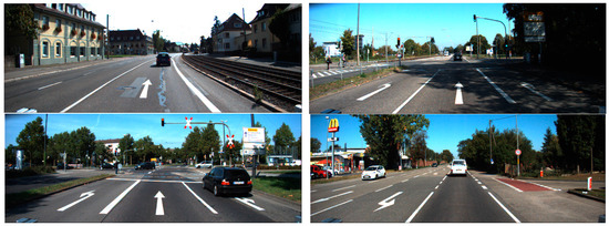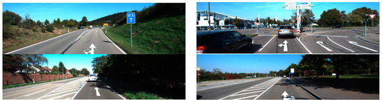 As shown in Figure 3, Figure 4, Figure 5, Figure 6, Figure 7 and Figure 8, we used the Road marking dataset [6,28], KITTI dataset [29,30], the Málaga dataset 2009 [31], the Málaga urban dataset [32], the Naver street view dataset [33], and the Road/Lane detection evaluation 2013 dataset [34] to generate our training and testing data. Each dataset has different image sizes with various illumination and shadow attributes. Six types of arrow-road markings were obtained from the images of these datasets. They are classified into six categories: FA, FLA, FLRA, FRA, LA, and RA.
