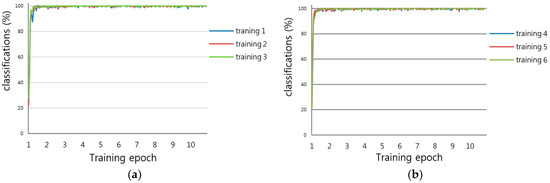 We applied a MATLAB implementation [38] to train the CNN model. Through bi-linear interpolation, the experimental image, with a size of 194 × 94 pixels, was resized to 265 × 137 pixels of 8 bit gray, and then used for the CNN training and testing. For experiments, we performed a 13-fold cross validation. That is, among the entire dataset of 163,809 images, 92.7% (151,809 images) and 7.3% (12,000 images) were randomly selected for training and testing, respectively, and thirteen iterations of this procedure were executed. Using these results, we measured the average accuracy of recognition of an arrow marking. Our training process iterated over 10 epochs, performing 1200 iterations for each epoch. The initial learning rate was 0.01 with a learn-rate-drop factor of 0.1 after every 25 epochs. The classification accuracies of the training data, according to the training epoch when performing the 13-fold cross validation, are shown in Figure 11. Figure 11 also shows that the classification accuracy of 100% was obtained in each training case of the 13-fold cross validation.