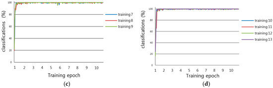 Classification accuracies of training data over 13-fold cross validation; “classifications” means “classification accuracy of training data”: (a) Training 1–3; (b) Training 4–6; (c) Training 7–9; (d) Training 10–13.