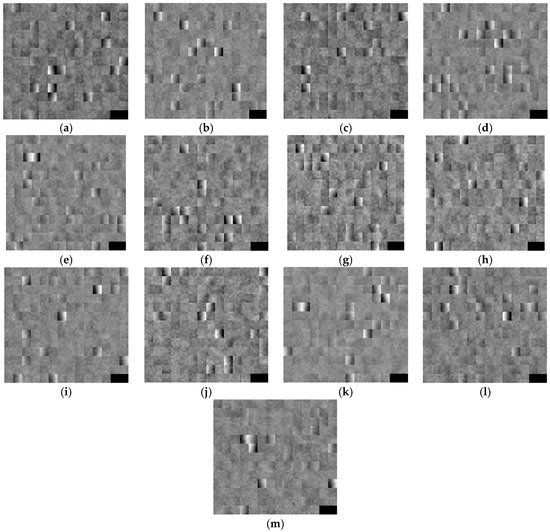 The obtained filters from the 1st convolution layer through training: (a–m) the filters from the 1st–13th trainings among 13-fold cross validation are presented, respectively.