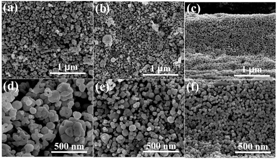 SEM images of ZnCo2O4 nanoparticles: (a,d) sample A; (b,e) sample B; and (c,f) sample C.