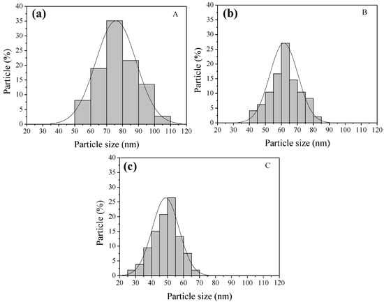 Particle size distribution for the ZnCo2O4 samples: (a) A; (b) B; and (c) C.