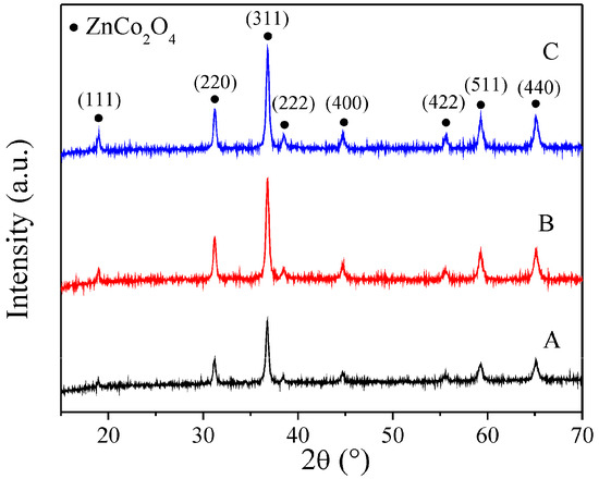 XRD patterns of ZnCo2O4 samples synthesized with (A) 5.4; (B) 10.8; and (C) 16.2 mmol of dodecylamine. The peak signals for the ZnCo2O4 structure (JCPDF 23-1390) are labeled with black-filled circles.