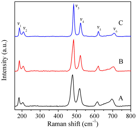 The formation of the oxide ZnCo2O4 was also confirmed by Raman characterization. According to the group theory for oxides with a spinel structure, five active Raman bands were expected: A1g + Eg + 3F2g [47]. Figure 5 shows the Raman spectrum indicating the main vibrational bands produced by the ZnCo2O4 spinel crystal structure. The bands labeled by v1, v3, v4, v5, and v6 correspond to 182, 475, 516, 613, and 693 cm−1, respectively. These bands are assigned to the F2g, Eg, F2g, F2g, and A1g symmetry species. These results are consistent with those reported for ZnCo2O4 spinel structures [48]. Interestingly, the band located at 204 cm−1 (v2) is a vibrational mode that could be attributed to a Co3O4 spinel structure [49]. The formation of Co3O4 is likely due to the cation disorder (substitution of Zn2+ by Co2+) in the spinel structure of the zinc cobaltite. Notice that the Co3O4 possesses a spinel structure similar to that of ZnCo2O4. Therefore, the XRD patterns between Co3O4 and ZnCo2O4 are almost indistinguishable.