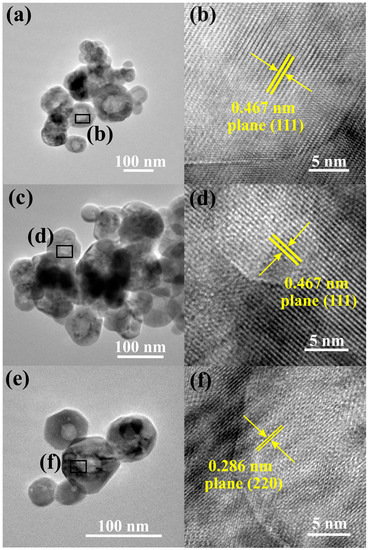 Figure 6 shows TEM images of the samples. The presence of faceted nanoparticles with a pockmarked structure was clearly identified (Figure 6a,c,e). The estimated average particle size was approximately 75, 61, and 49 nm for samples A, B, and C, respectively; these measurements are consistent with the SEM analysis. The standard deviation was ±12.64, ±8.78, and ±8.36 nm, respectively. Figure 6b,d,f shows HRTEM images of the selected area marked with a black rectangle. These images confirmed the presence of faceted ZnCo2O4 nanoparticles as was done by the XRD patterns and the Raman characterization. Fringe spacings of 0.467 and 0.286 nm are clearly observed, which are attributed to the planes (111) and (220) of the ZnCo2O4 spinel structure, respectively.
