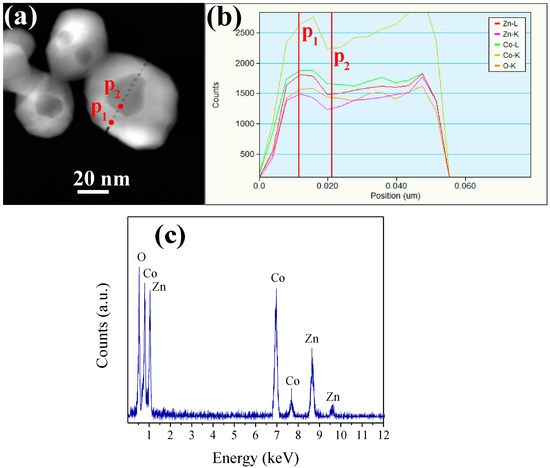 To investigate the nanoparticle composition, an EDS line scan was performed on sample A (see Figure 7). Figure 7a shows a HAADF-STEM image of the ZnCo2O4 nanoparticles. The image confirms the presence of faceted nanoparticles with a pockmarked structure, which is consistent with the TEM images. In the EDS line scan, zinc, cobalt, and oxygen are observed across the linear mapping, confirming the presence of the expected elements, as seen in Figure 7b. In the central region p2, a decrease of the element composition is observed in comparison to point p1, which can be due to the irregular surface of the nanoparticle (pockmarked zone). Similar EDS elemental line scan spectra were obtained for samples B and C. Figure 7c shows an EDS microanalysis on p2, where the individual elements Zn, Co, and O can easily be seen. The atomic ratio of Zn:Co is approximately 1:1.96, which is consistent with the composition of ZnCo2O4. This EDS spectrum is in agreement with the literature [3,5].