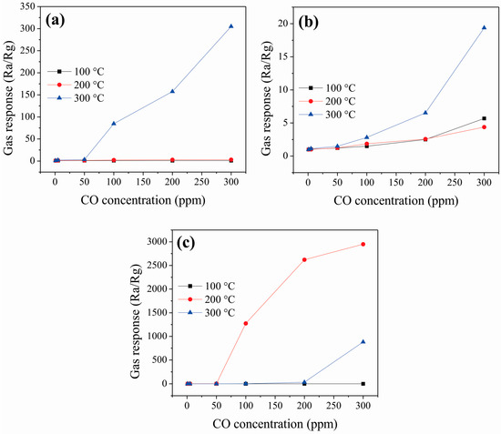 Gas response of ZnCo2O4 sensors vs. CO concentration at different operating temperatures: (a) sample A; (b) sample B; and (c) sample C.