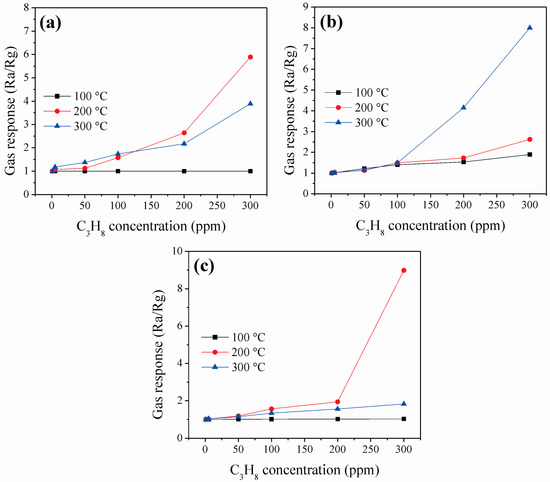 The response of the ZnCo2O4 sensors in propane atmospheres at different operating temperatures is shown in Figure 9. Such as in the case of CO, the response rose with the increasing of temperature and propane concentration. However, at temperatures below 100 °C, no changes were observed in the response. At 100 °C, a sensing response value of ~1 was calculated for the sensors A and B in the range of 1–300 ppm of C3H8 (Figure 9a,c). At the same temperature, the sensor B registered values of 1, 1.03, 1.13, 1.49, 1.76, and 2.62 for C3H8 concentrations of 1, 5, 50, 100, 200, and 300 ppm, respectively (as seen in Figure 9b). Again, the sensor based on sample C also exhibited a higher response than those of A and B at a working temperature of 200 °C. The response values for this sensor C were 1, 1.03, 1.18, 1.56, 1.94, and 8.99 at C3H8 concentrations of 1, 5, 50, 100, 200, and 300 ppm, respectively. The sensors based on A and B also exhibited good response to 300 ppm of C3H8: 5.89 at 200 °C, and 8 at 300 °C, respectively. Additionally, the three ZnCo2O4 sensors showed a decrease in gas response when the test gases were removed from the vacuum chamber.