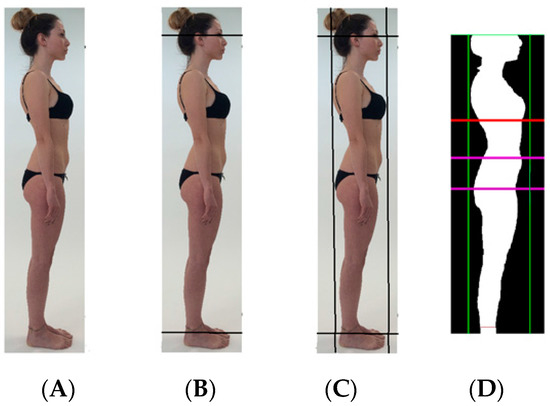 An operator uploaded the image (Figure 1A) and then framed the image by using software that provides an outline of the body to be conditioned with color to contrast the subject image from the background of a different color. The operator first positioned horizontal lines through the eyes and malleoli of the ankles (Figure 1B), and next inserted vertical lines along the widest anterior and posterior of the image (Figure 1C). An algorithm utilized a complex evaluation of the background pixel digits and allocated to that homogeneous pixel a value equivalent to black; the algorithm next allocated to the subject body image (e.g., non-background) pixels a value equivalent to white. This process represents the conditioning of an individual digital photograph with additional horizontal lines drawn by the proprietary software at the thorax, belly, and hips (Figure 1D). The determination of the populations of black and white pixels enables computation of the respective occupation percentages, specifically the individual image surface area.