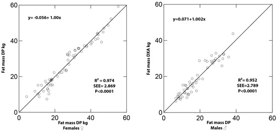 Plots of dual X-ray absorptiometry (DXA)-measured and digital image photography (DP)-predicted fat mass (FM) values of females (left) and males (right).
