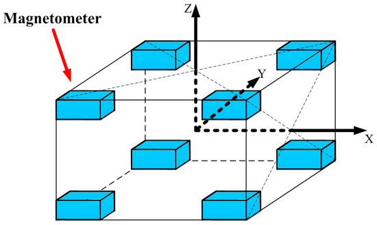 The magnetometers are put on the eight vertices of the cube, and the magnetic tensors of six faces are measured.
