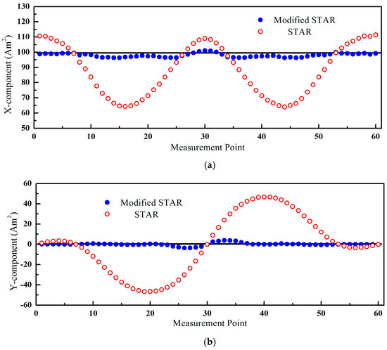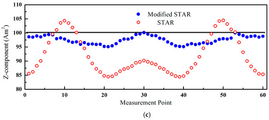 Figure 2b, the maximum error of STAR method in Z-axis was about 0.4 m. Meanwhile, the localization errors of STAR were closely related with the measurement point. Compared with STAR method, the proposed method could compensate almost all asphericity errors. The positions calculated by the modified STAR method almost overlapped the true values. The maximum errors of the proposed methods on X-axis, Y-axis, and Z-axis were 3 cm, 4 cm, and 3 cm, respectively. Considering the distance between magnetic target and magnetometer array, the errors of localization of the proposed method were less than 1%. In this simulation experiment, the magnetic moment was very large, and the signal-to-noise ratio (SNR) was more than 40 dB. Therefore, the noises of the magnetometers had little effect on the localization results. The errors of the modified STAR method were mainly from two parts. One was the tensor measurement errors caused by using the difference between magnetometers to approximate the magnetic gradient field. The other one was the errors caused by the asphericity parameter