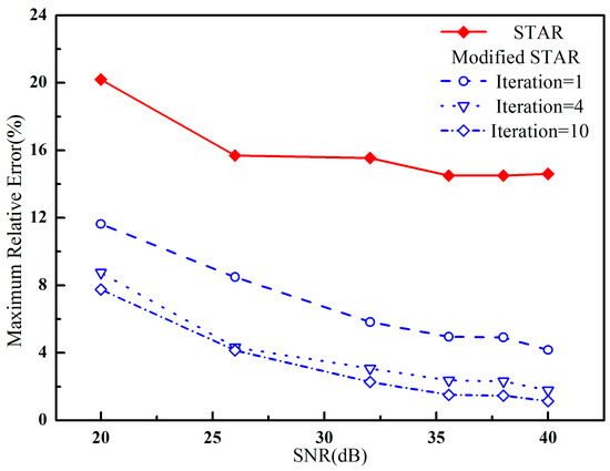 Figure 5. It was shown that the accuracy of the proposed method was much higher than that of the STAR method. The relative error of the modified STAR method decreased as the iteration number increased. Meanwhile, the accuracy almost reached to the theoretical limit when the iteration number was up to 4. Therefore, the convergent rate is fast.