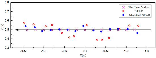 Figure 2a, the positions calculated by STAR method were on the bottom right of the true value, as indicated by the arrows. The X-axis differences between the true value and the estimated value of STAR were even more than 0.5 m, and the Y-axis differences reached to 0.37 m. As shown in