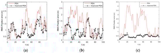 RMS position error statistics using PDA and improved PDA in different density clutter. (a) ; (b) ; and (c) .