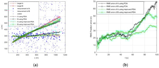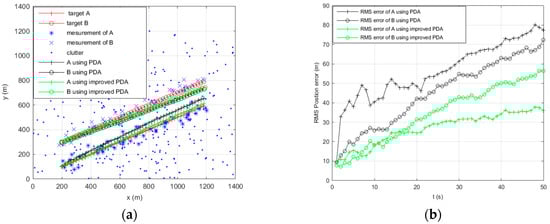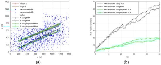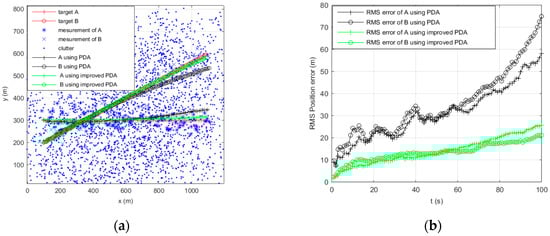 Tracking two crossing targets using PDA and improved PDA when clutter . (a) Tracking of the target position; and (b) RMS position error of the target.