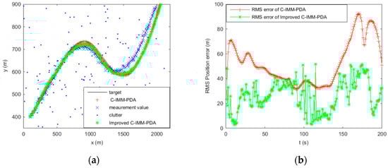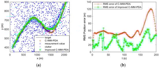 Maneuvering target tracking using C-IMM-PDA and improved C-IMM-PDA when clutter . (a) Tracking of the target position; and (b) RMS position error of the target.