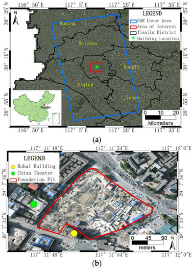 (a) Location of the AOIand coverage of SAR data for subsidence monitoring in the Tianjin region, with aerial ortho-photo of 1 m as background; and (b) location of two experimental buildings near a foundation pit, with aerial ortho-photo of 0.2 m as background.