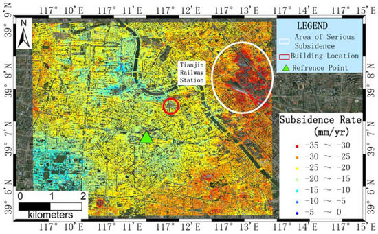 The final annual velocity of displacement in the AOI after the correction of the overall offset caused by reference point (marked with green triangle) is displayed in Figure 2. The overall annual velocity around our AOI varied from −35 to 0 mm/year, and most of the analyzed areas displayed velocities of approximately −20 mm/year. Some partial regions have velocities smaller than −30 mm/year, for example the area near the Tianjin Railway Station (marked with a white ellipsis). The area corresponding to the location of two buildings (marked with a red ellipsis) have subsidence velocities of approximately −20 mm/year.