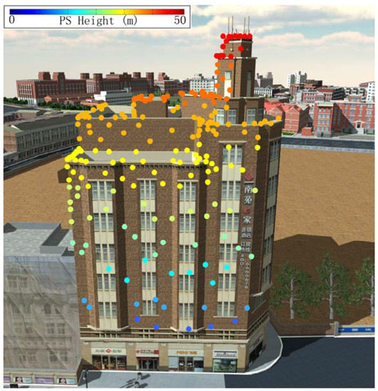 Three-dimensional representations of extracted Permanent Scatterer (PS) point geocoded on precise 3D models for the Bohai Building. All the PS satisfying the stability criteria during IPTA processing (sub-correlation coefficient larger than 0.35 and amplitude deviation measure larger than 1.4) have been located on roof and facades toward the satellite, in the monitoring period from May to December 2014.