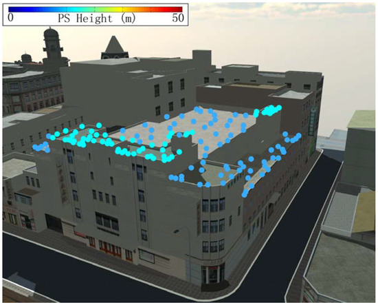 A strategy for extracting building PS was applied for further building deformation analysis in consideration of complex urban environment. A rich and precise geographic database containing urban buildings mapped to a scale of 1:2000 was used to recognize the building to which each PS corresponds. Overlay analysis was used to match geocoded PS and the geographic database to obtain primary building PS [27]. Inaccurate buildings PS were further filtered by considering the features of buildings in SAR images. Figure 3 and Figure 4 show the three-dimensional (3D) representations of the locations of extracted PS point geocoded on precise 3D models for the Bohai Building and the China Theater, during the monitoring period from May to December 2014. The stabilities of all extracted PS were in the range of selecting PS during IPTA process. Figure 3 shows 117 PS located on the roof, and on both facades of the Bohai Building. In Figure 4, 68 PS are located on the roof of China Theater. These PS in the two building are used for the leveling validation test.