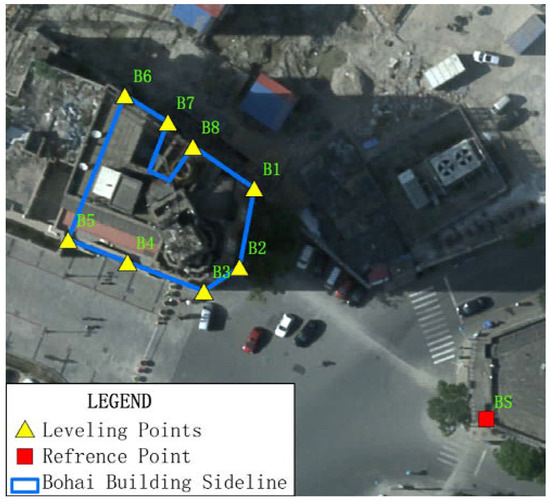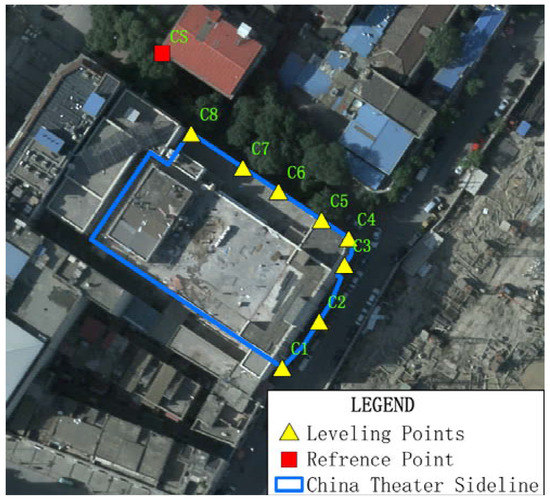 For the validation test, a set of leveling points was installed on the Bohai Building and the China Theater, while the points installed separately on nearby buildings served as reference points. During the construction of the foundation pit, their displacements were record by a survey team. We used these optical leveling results to validate displacement values extracted from InSAR data. In the case of the Bohai Building, eight points were installed for the test and were sequentially named B1 to B8. The reference point for the Bohai Building was named BS (Figure 5). In the case of the China Theater, eight points were also installed for validation, and they were named C1 to C8, and the reference point was named CS (Figure 6).