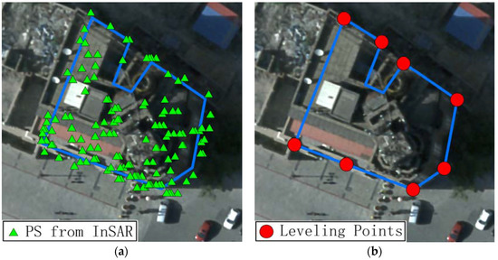 Spatial Diversity between InSAR and leveling in the Bohai Building with aerial ortho-photo of 0.2 m as background: (a) more than one hundred PS were located whole building from the vertical view; and (b) eight Leveling Points were located on edges of the Bohai Building.