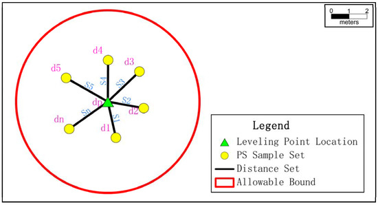Considering that the displacement phenomenon has the attribute of spatial persistence, the Inverse Distance Weighted (IDW) interpolation method was used to create a mapping of InSAR displacement for locations corresponding to the leveling points, from the high-density PS sample set. IDW was proposed on the basis of the first principle of geography, which states that if two objects are closer, the features have greater similarity [30]. In the case of the deformation dataset from IPTA analysis, the IDW interpolator was deployed on the basis of discrete PS; the distances between the PS locations and the leveling location were used as weights, and the InSAR displacement was used to estimate the displacement in the corresponding level points [4]. Setting the weight by distance in the PS sample set prevents increasing errors caused by a single point during IDW interpolation, such as facade PS scattered by the roads.