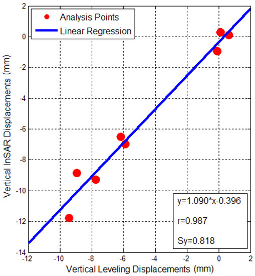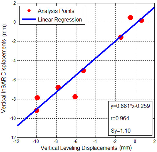 OLS regression result between InSAR and leveling displacement of the Bohai Building is shown in Figure 10. For these eight points in the figure, the x-axis represents displacement from leveling, and the y-axis indicates displacement estimated by InSAR. The blue line represents the linear regression result. The eight red points are near this line, which shows that the regression equation fits these data closely. The deviation from the linear relation of was approximately 12% with a bias of approximately 0.259 mm. The linear correlation coefficient value is 0.964 (very close to the constant of 1), implying that the fit between InSAR measurements and leveling of the Bohai Building is very high. The estimated standard deviation was 1.10 mm, indicating that the InSAR accuracy in the Bohai Building reached the accuracy of nearly 1 mm.