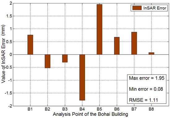 Measurement from classical leveling is used as a true deformation value to analyze the InSAR error in the Bohai Building; the measurement error results for the InSAR deformation values are reported in Figure 11. The maximum error is located in B5 with a value of 1.95 mm, and the location of minimum error is B8 with a value of 0.08 mm. An analysis of the eight error values using Equation (4) shows that the RMSE of is 1.11 mm, indicating that the accuracy of InSAR for the Bohai Building reached the accuracy of near 1 mm.