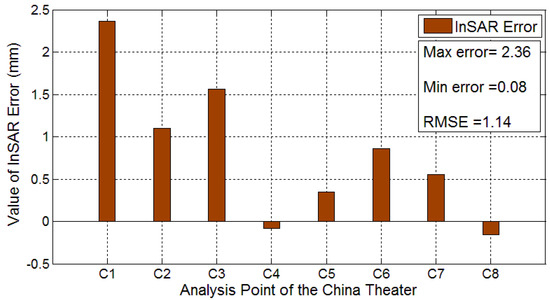 The high accuracy leveling measurements were used as a true value of displacement when analyzing the InSAR error of measurement for the China Theater. The final InSAR error results are reported in Figure 13. The maximum error is located in C1 with a value of 2.36 mm, and the location of minimum error is C4 with a value of 0.08 mm. The RMSE of is 1.11 mm, calculated from Equation (4) and the eight error values, which also indicates that the accuracy of InSAR in the China Theater reaches nearly 1 mm.
