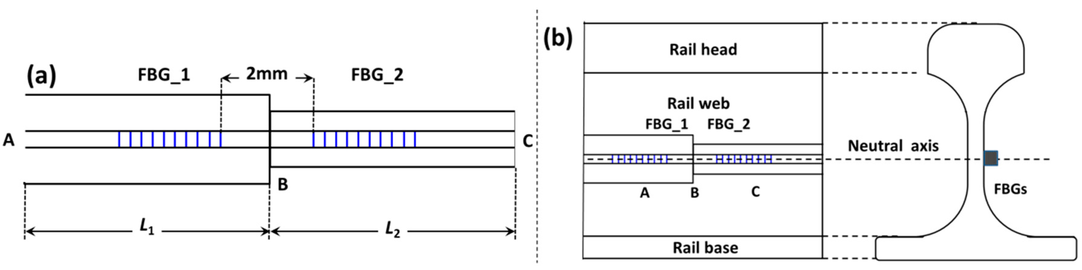 The structure of the hetero-cladding FBG sensors is schematically shown in Figure 1a. It consists of two FBGs with different cladding thicknesses separated by a fiber that is 2 mm long. The FBGs were fabricated in a singlemode fiber using the phase mask-based FBG writing technology, and the central wavelength of FBG_1 and FBG_2 are different. The hetero-cladding structure is obtained via the chemical etching method. FBGs with different cladding thicknesses can be fabricated by controlling the etching time. In practical applications, in order to avoid the influence of the wheel concentrated load, Points A and B (as shown in Figure 1a) should be fixed along the neutral axis of the rail between two fasteners, as illustrated in Figure 1b. In addition, during the sensor installation, the pre-stress must be applied to tense the fiber between Points A and C when the temperature changes.
