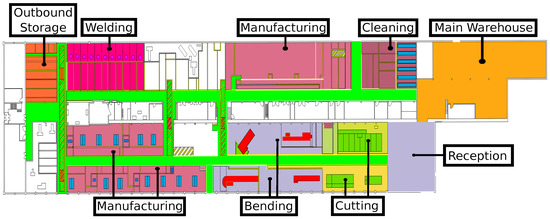 In Figure 1 it is represented the floor map of the pipe workshop that Navantia owns in Ferrol (Galicia, Spain). The areas colored represent the main operative areas, while in white are offices and other secondary auxiliary areas. The following are the most relevant areas: