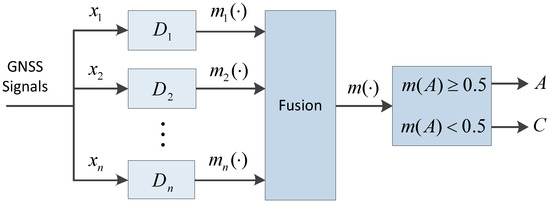 Figure 1 shows the diagram of the detections’ fusion. Detector points at , which could be any feature of the GNSS signals or measurements, such as signal power, Doppler shifts, code delay, pseudoranges, the results of positioning, etc.